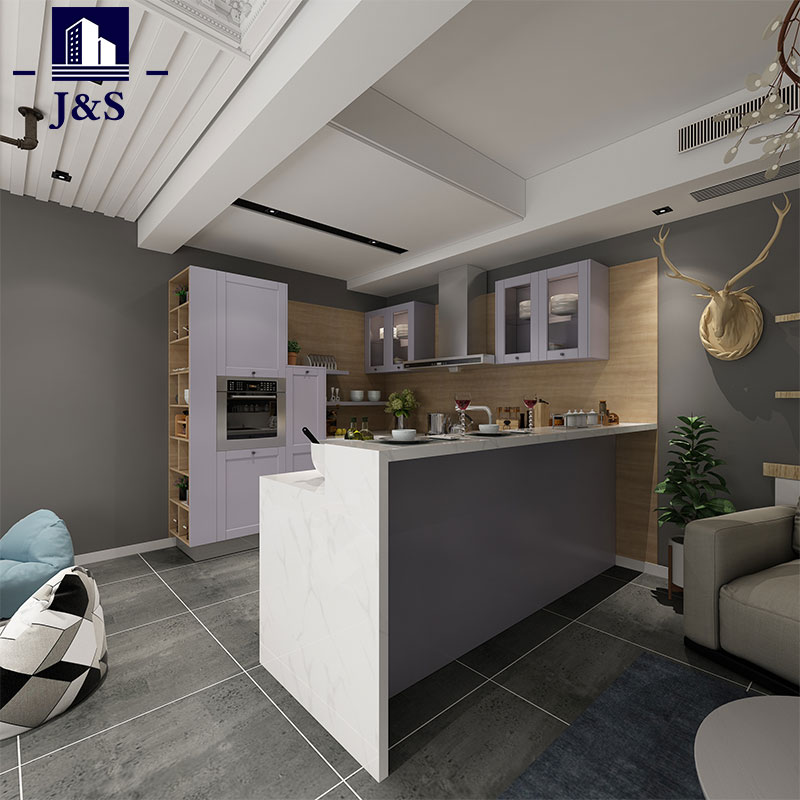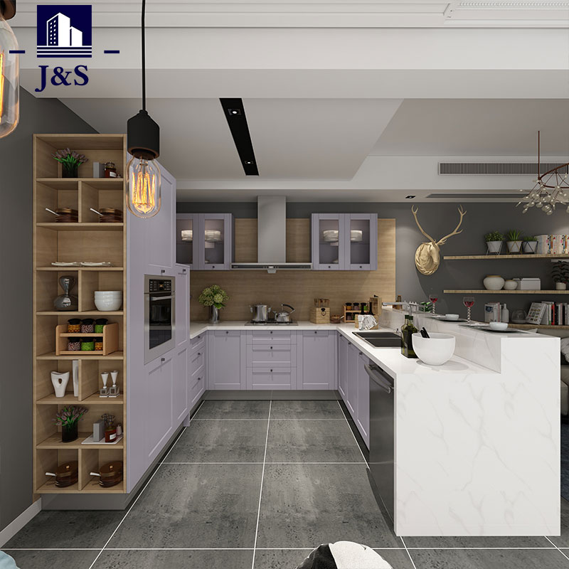 Vi leverer Shaker køkkenskabe skuffeskabe, dette er et køkkenskabsdesign i landlig stil med PVC-finish. Kombinationen af retro shaker dørpanel og lysegrå farve, sidekammer med åbne hylder af natur eg giver hele køkkendesignet en følelse af at være poetisk og være tilbage til naturen. Æstetisk er aldrig det eneste køb af køkkenskab. For bedre at udnytte pladsen er det funktionelle tilbehør som krydderiudtræk og tallerkenudtræk monteret i dette lille L-formede køkken.