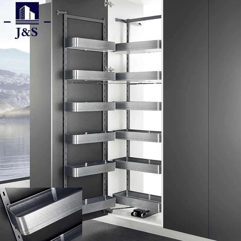 Der er mange stilarter af pull-kurve, Soft-stop Tall Larder Organizer Pull Out Pantry Unit Basket, som kan løse mange problemer med opbevaring af køkkenudstyr. Det er praktisk for os at tage servicet, og gør det også nemt at sortere og placere servicet.